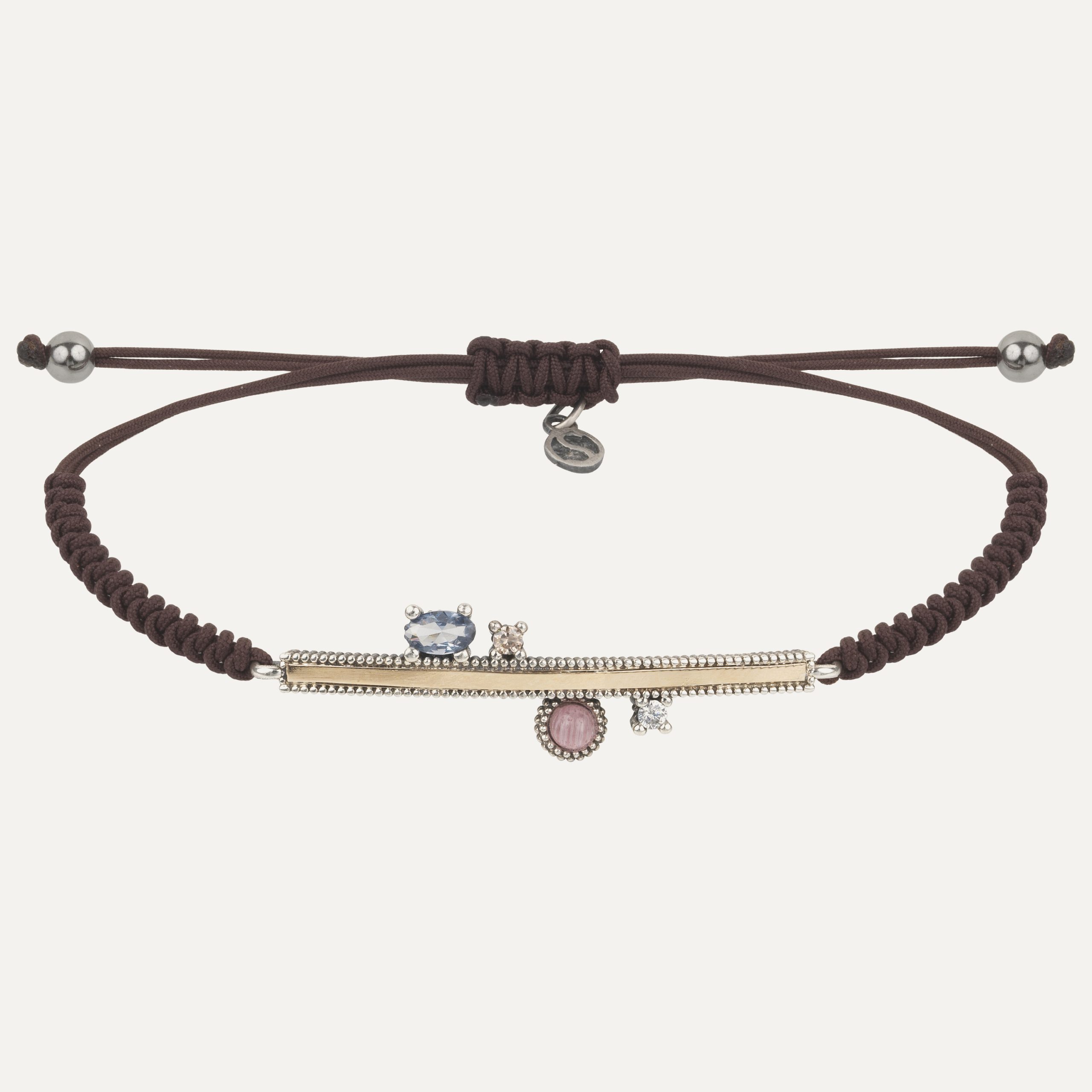 L’une des pièces phares de Sunfield sont les maxi-colliers et dans la collection Giselle in Paris, ils ne pouvaient manquer à l’appel. Il s’agit d’un pendentif en argent 925 et en or jaune 9k. D’un diamètre de 36 mm, il est composé d’une combinaison de cabochons de tourmaline rose et de calcédoine avec des péridots et des zircons roses taille brillant. Il est suspendu à une chaîne en argent de 80 cm de long.