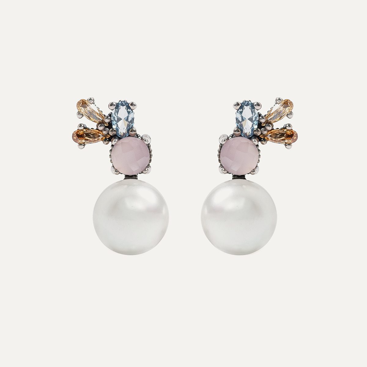 Un pendentif aux couleurs basiques comme le quartz rose du cabochon principal à facettes, le bleu aigue-marine du cabochon central et le rose plus foncé de la tourmaline qui le couronne.