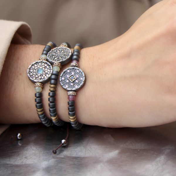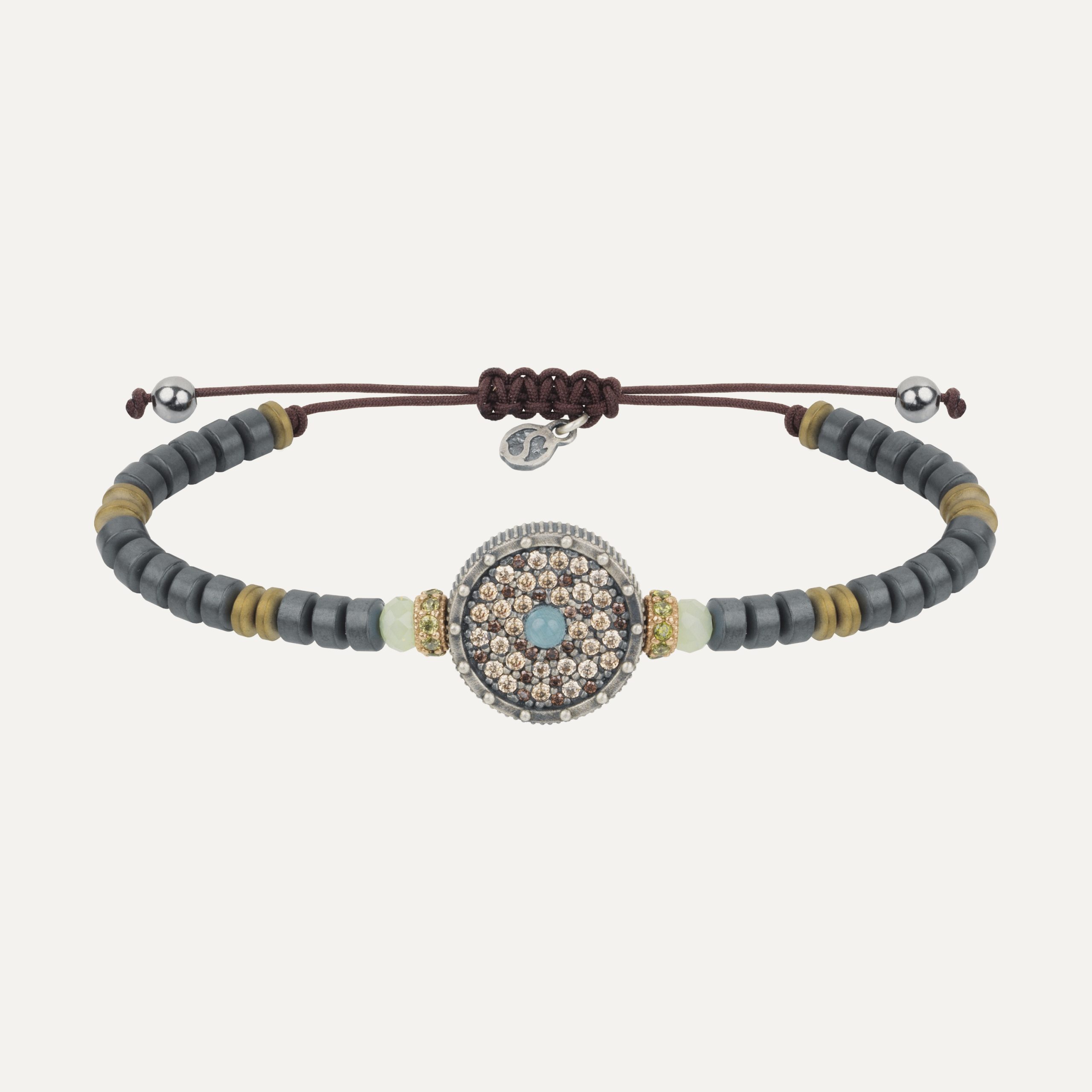 Les pendentifs Sena de Sunfield ont une forme de médaillon classique, bien que leur design n’ait rien de classique. Pendentif en argent 925 de 15,5 mm de diamètre avec un cabochon central d’opale bleue lisse entouré de zircons bruns de couleur champagne et de taille brillante. Chaîne en argent de 42,5 cm de long.