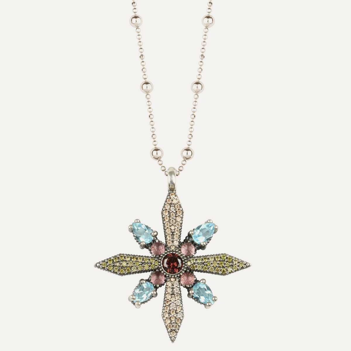 Pendentif en argent 925 avec quartz rose, calcédoine bleue, tourmaline rose et zircon.