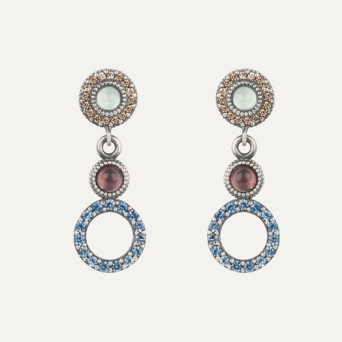 Boucles d'oreilles en argent 925 avec finition antique, calcédoine, tourmaline rose et zircon cubique.