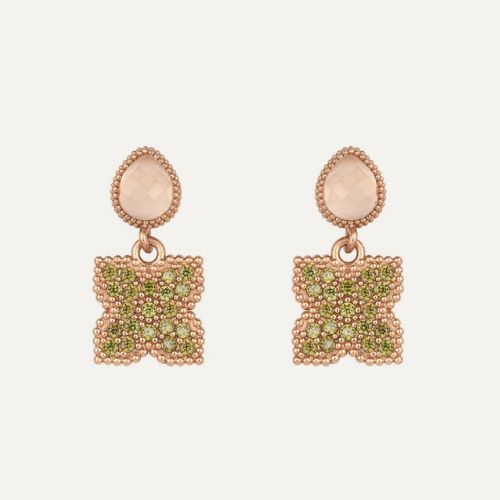 Boucles d'oreilles en argent 925 avec placage en or rose 24kt, pierre de calcédoine rose en forme de goutte et zircon vert.