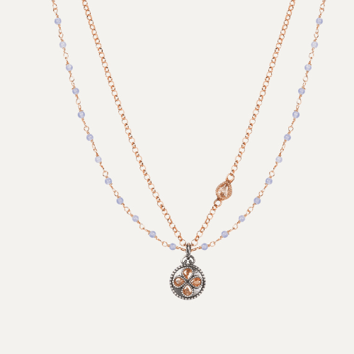 Pendentif en argent 925 avec une chaîne de rosaire et une chaîne supplémentaire de maillons, toutes deux en or rose, ornées de zircons de couleur ...