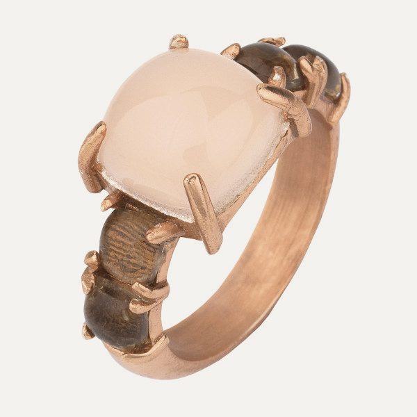 Bague en argent 925 plaqué or rose, calcédoine bleue, quartz rose et zircone.